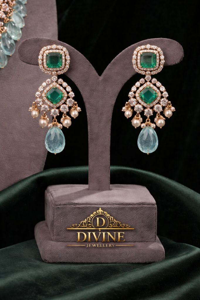 A luxurious multi-layer bridal necklace set featuring sparkling stones, bold emerald centerpieces, and elegant aqua drop beads, crafted in 92.5 silver with premium rose gold plating.