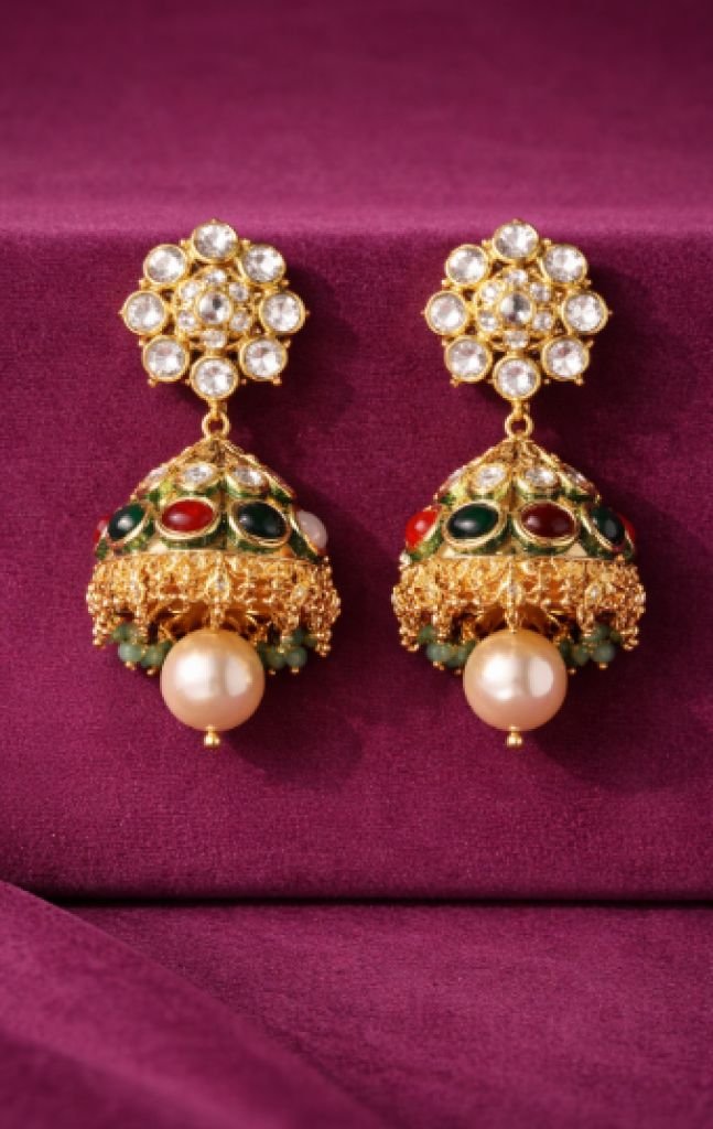 Heavy navratna pendant necklace with multi-layer bead chain and jhumka earrings, crafted in 92.5 silver with gold plating—perfect for bridal and festive wear.