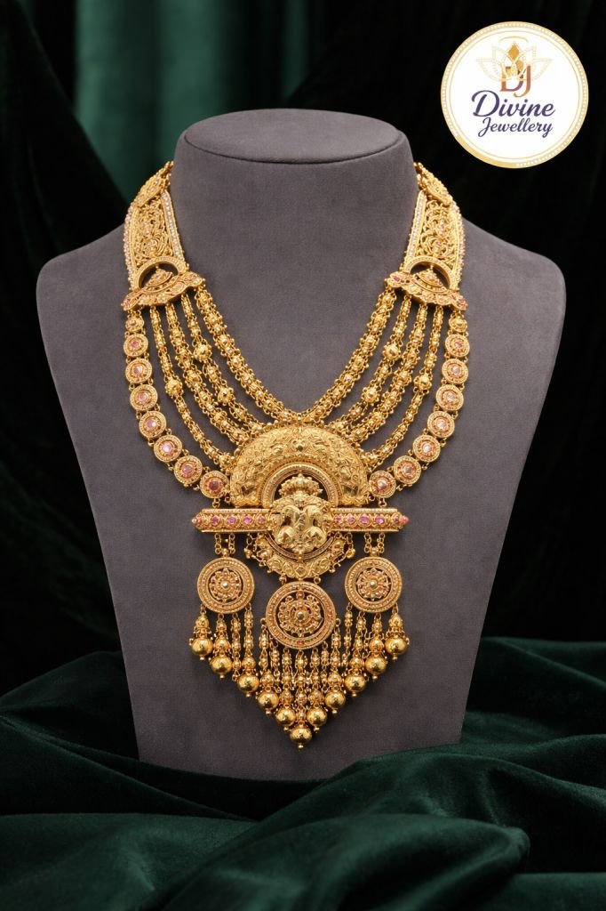 Royal temple jewellery set with layered bead chains, Lakshmi motifs, and antique finish in 92.5 silver gold plating—perfect for bridal & festive wear.