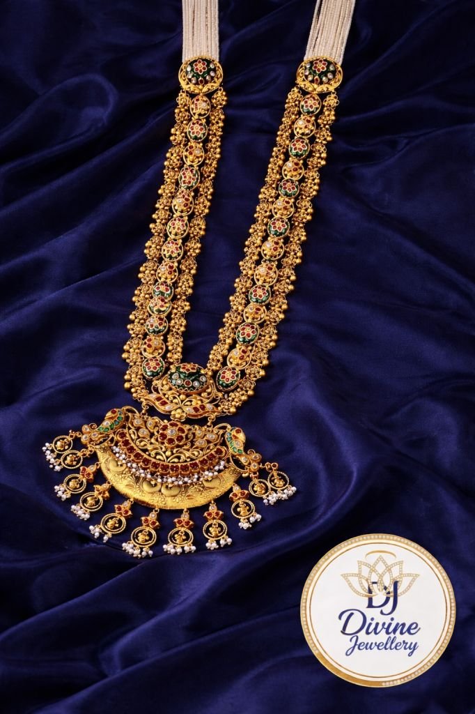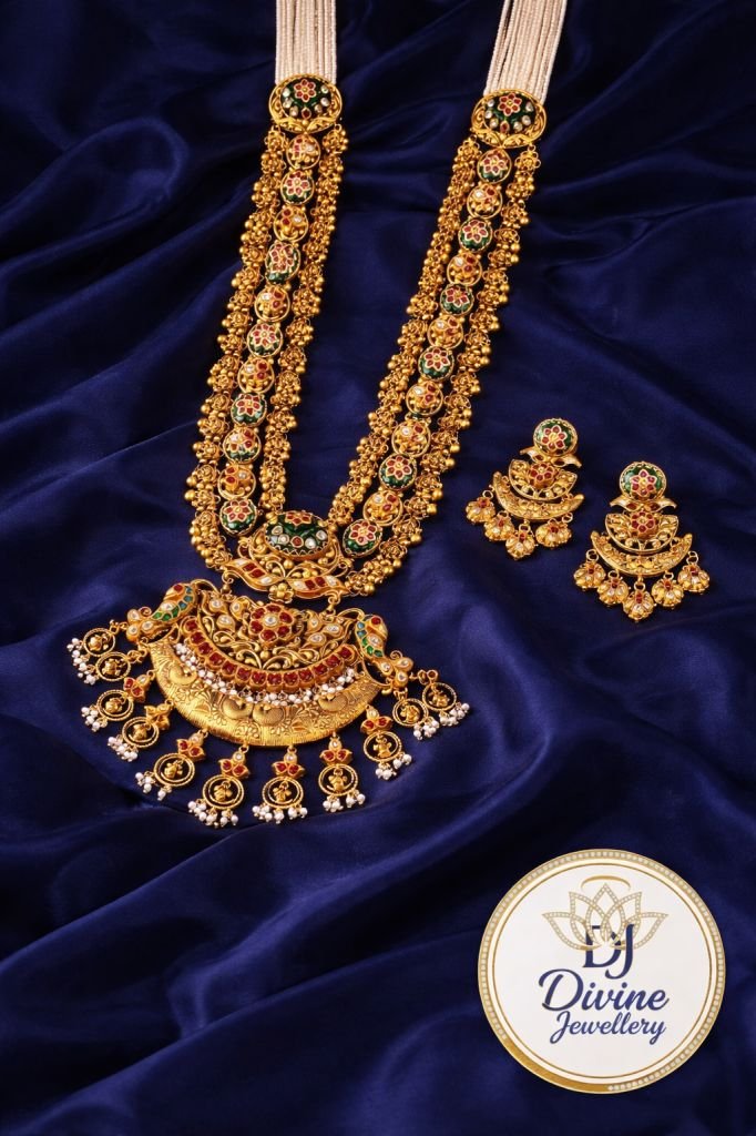 Luxurious 92.5 silver gold-plated long haar necklace set with intricate temple design, multi-layer detailing, and matching jhumka earrings. Perfect for bridal and grand festive wear. Customizable in gold or rose gold plating.