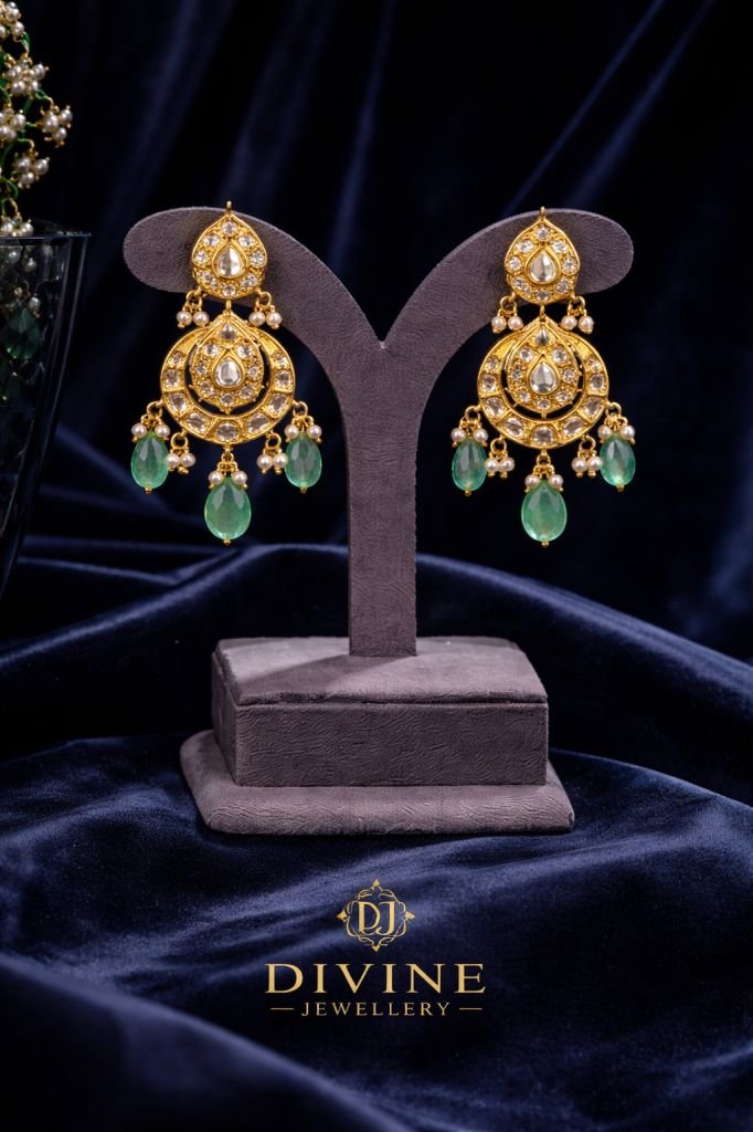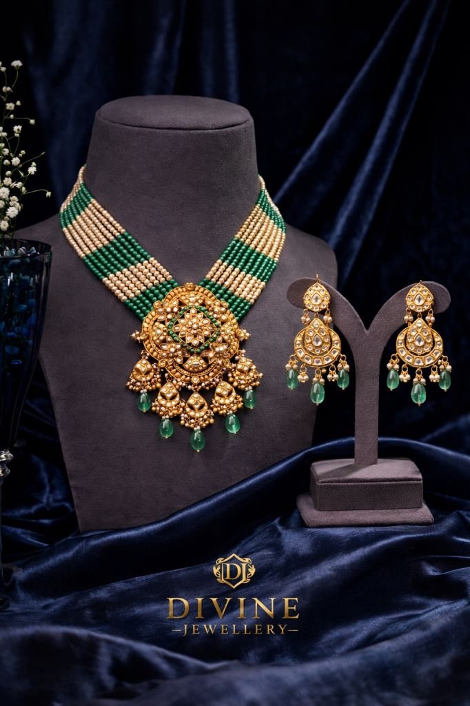 Green Beaded Pendant Necklace Set with Statement Polki Pendant & Earrings – 92.5 Silver Gold Plated Jewellery | Divine Jewellery