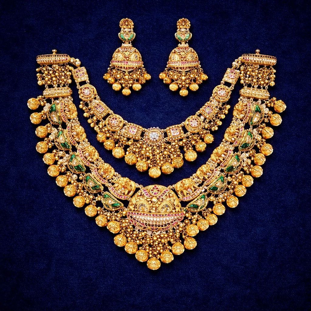 Grand temple bridal necklace set with layered design, coin motifs, green accents, and rich jhumka-style hanging elements.