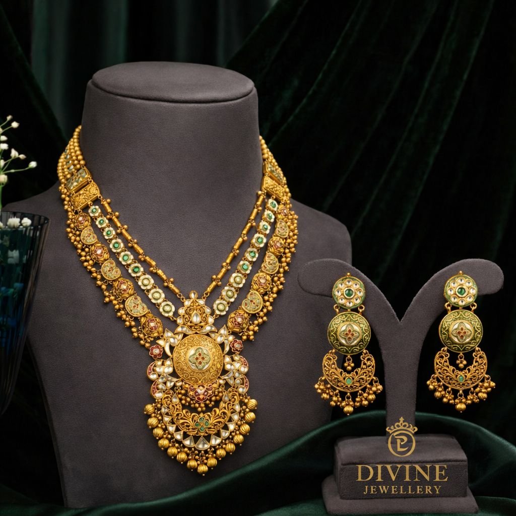A royal layered necklace set crafted in 92.5 silver with gold plating, featuring kundan work, meenakari detailing, and a grand statement pendant for a heritage bridal look.