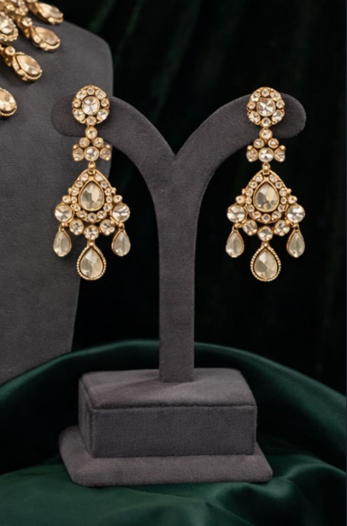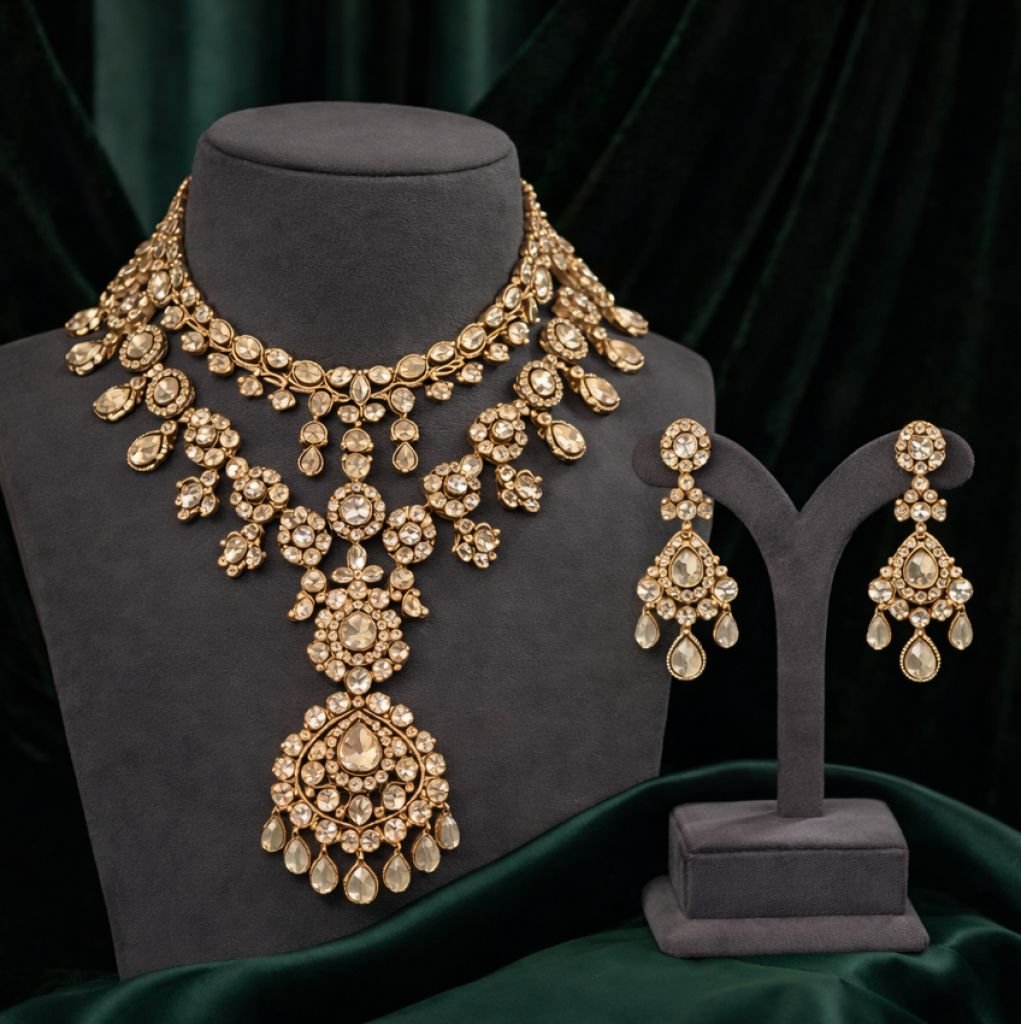 Heavy bridal polki necklace with layered detailing and statement drop pendant in champagne-tone stones.