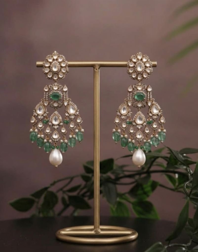 Luxury Polki Style Emerald Pearl Choker Necklace Set with Earrings – 92.5 Silver White Gold Plated Bridal Jewellery | Divine Jewellery