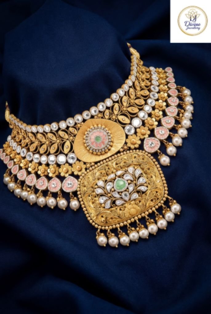 A luxurious floral Kundan choker with pearl drops and pastel meenakari detailing, crafted in 92.5 silver with gold plating—perfect for royal bridal styling.