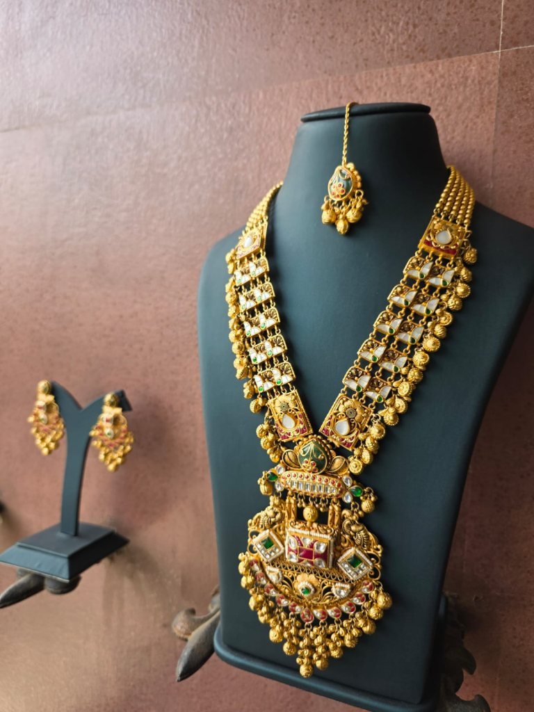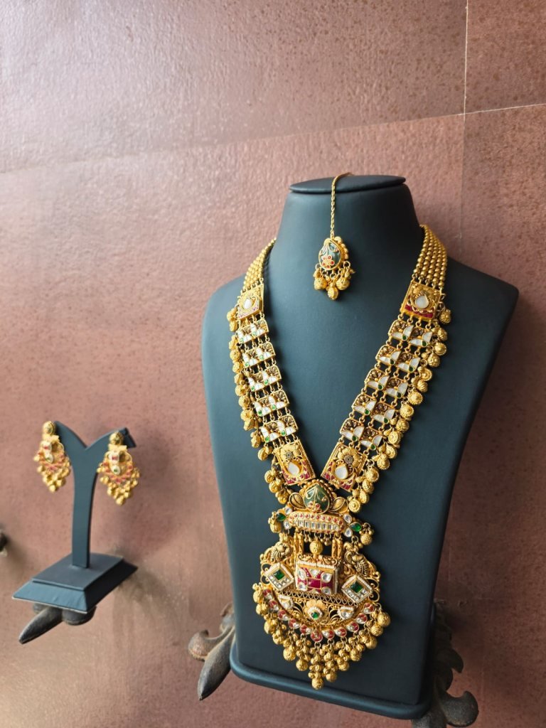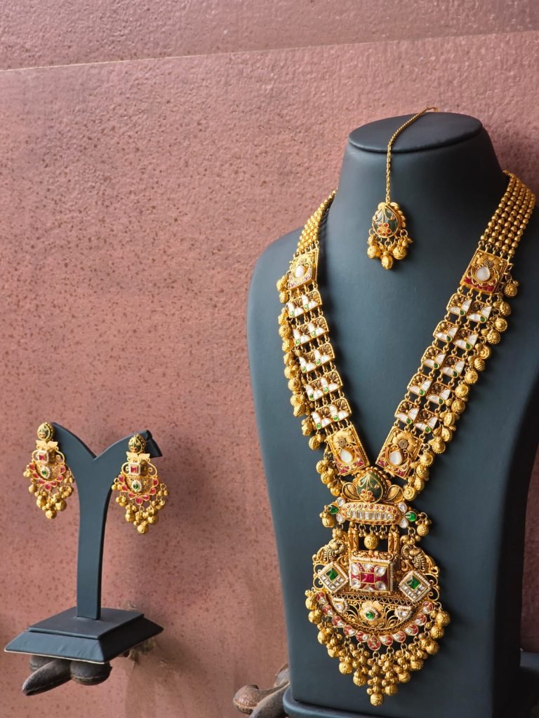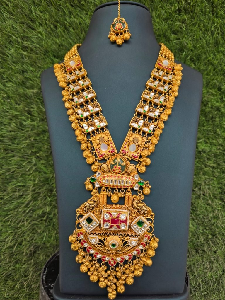 Inspired by South Indian and temple jewelry craftsmanship, this set is ideal for brides and women who love bold heritage pieces. Perfect for weddings, receptions, temple functions, and grand festive occasions, this jewelry set transforms any traditional outfit into a royal statement.