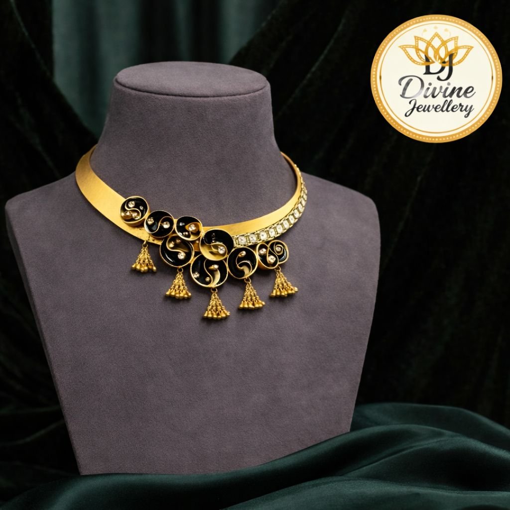 Stylish black enamel choker with gold finish and elegant drop elements in 92.5 silver gold plating—perfect for party & modern ethnic wear.