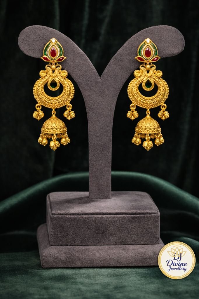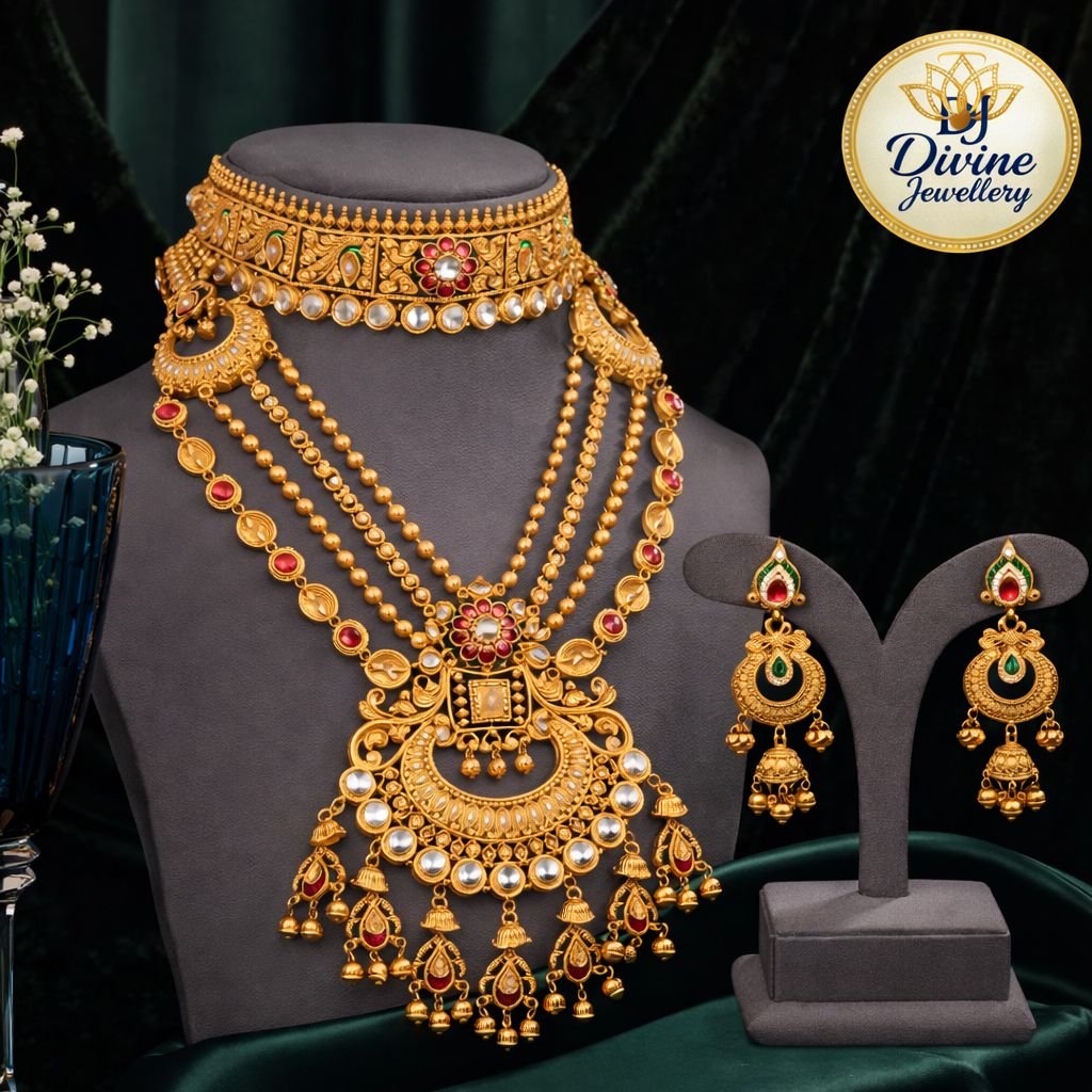 Grand 92.5 silver gold-plated layered bridal necklace set featuring temple choker, long chains, statement pendant, and matching jhumka earrings. Perfect for weddings & royal occasions.
