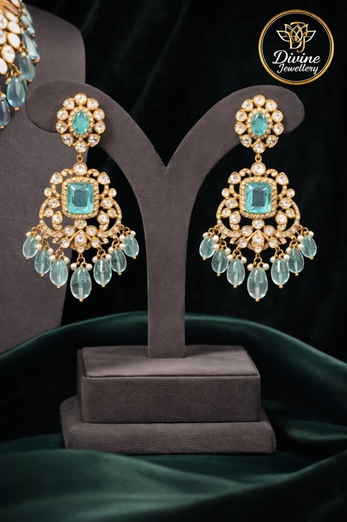Royal Aqua Kundan Necklace Set with Statement Pendant & Drop Earrings – 92.5 Silver Gold Plated