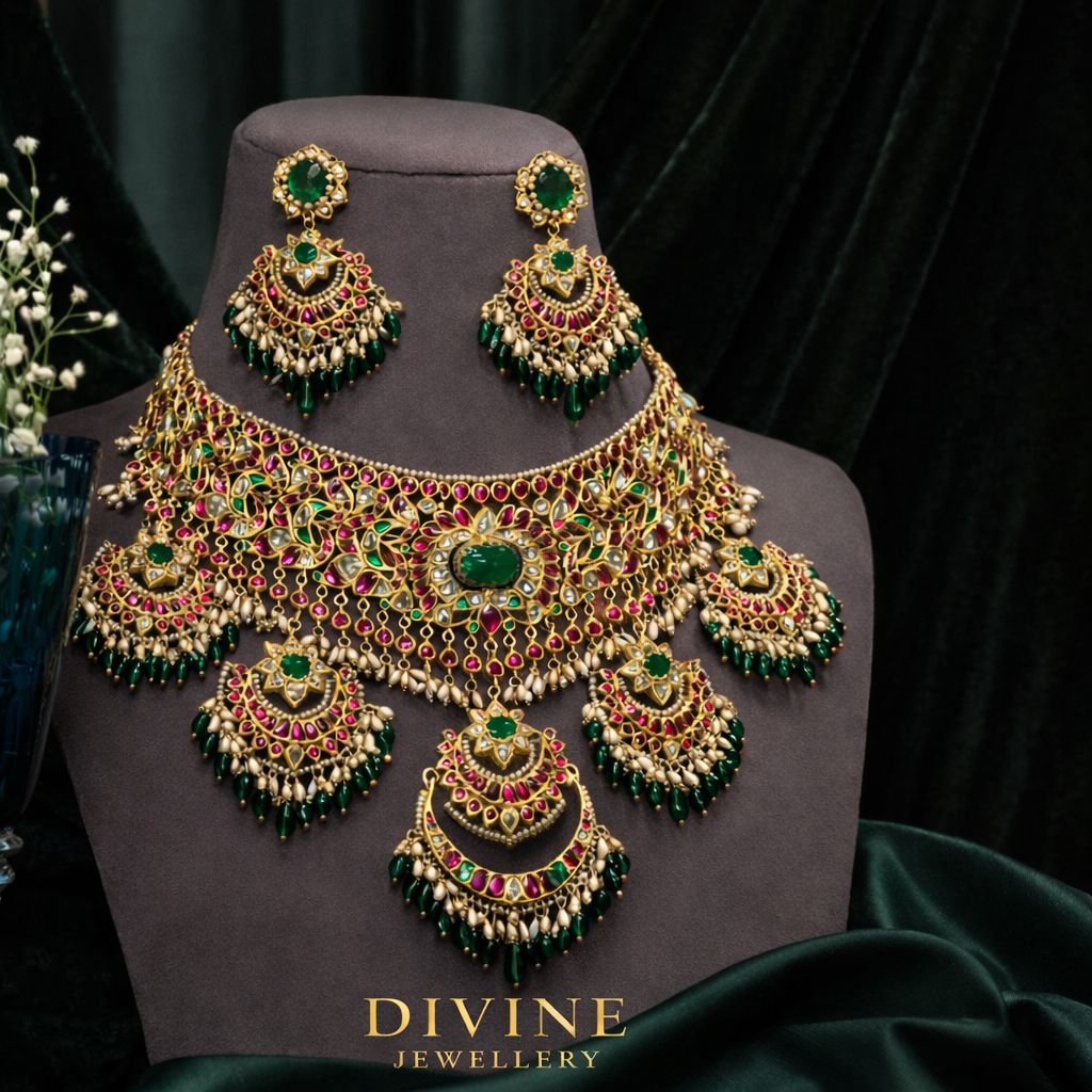 Make a grand bridal statement with this heavy Polki kundan necklace set featuring emerald green drops and matching chandbali earrings.