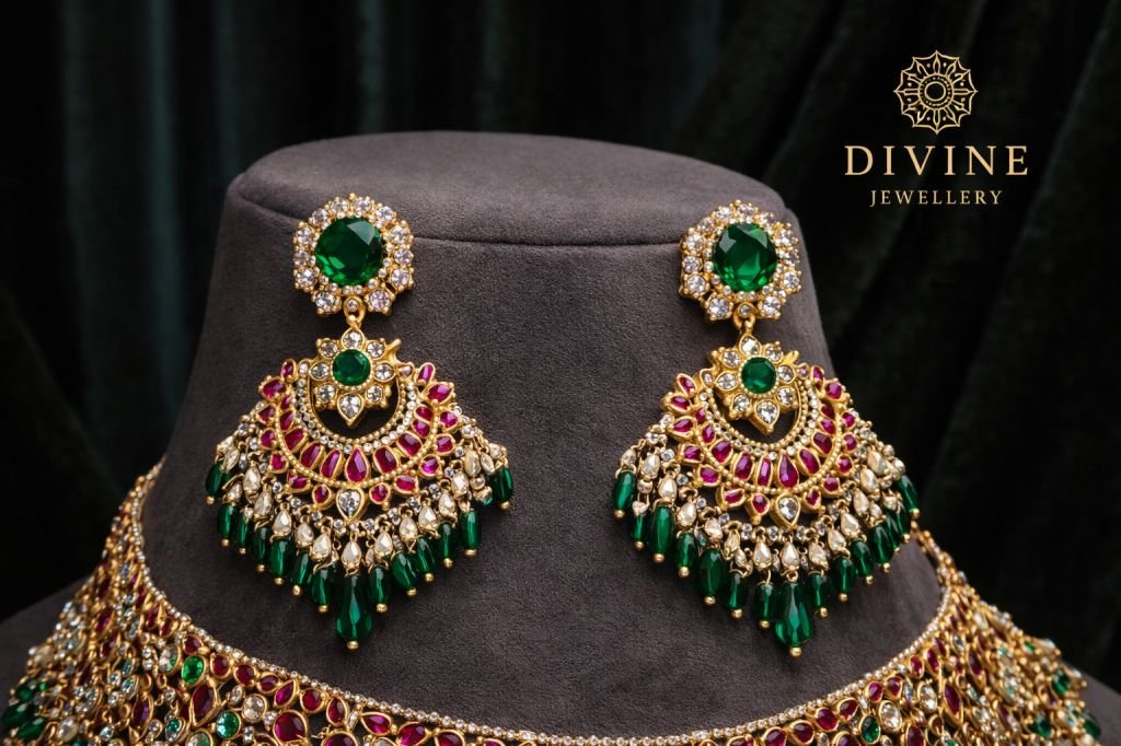 Royal Bridal Polki Kundan Statement Necklace Set with Emerald Green Drops & Chandbali Earrings – 92.5 Silver Gold Plated Heavy Jewellery | Divine Jewe