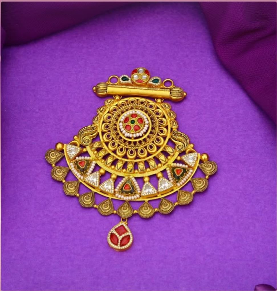Elegant 92.5 silver gold-plated temple pendant featuring circular chakra design with kundan-style stones and layered detailing. Perfect for bridal and festive wear.