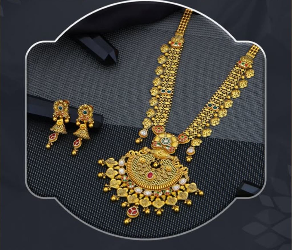 Traditional 92.5 silver gold-plated temple long necklace set featuring coin motifs and kundan-style stones. Perfect for bridal and festive wear.