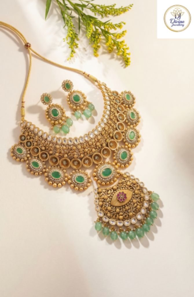 A majestic bridal necklace with emerald-tone stones and a grand pendant, crafted in 92.5 silver with antique gold plating for a royal look.