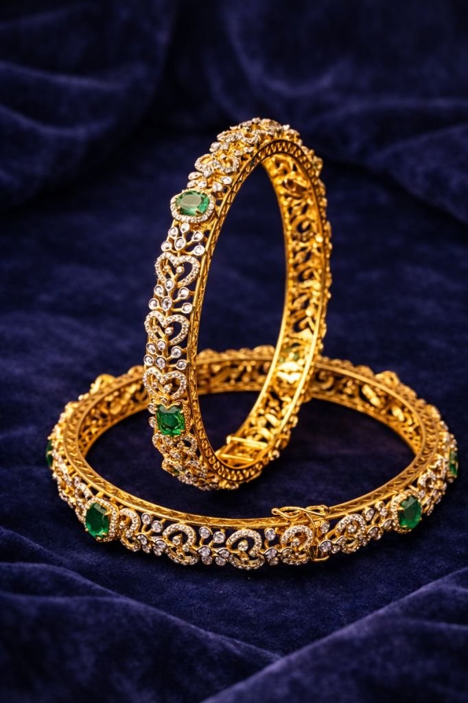 A pair of luxurious Kundan bangles adorned with emerald stones, crafted in 92.5 silver with rich gold plating—perfect for bridal and festive wear.