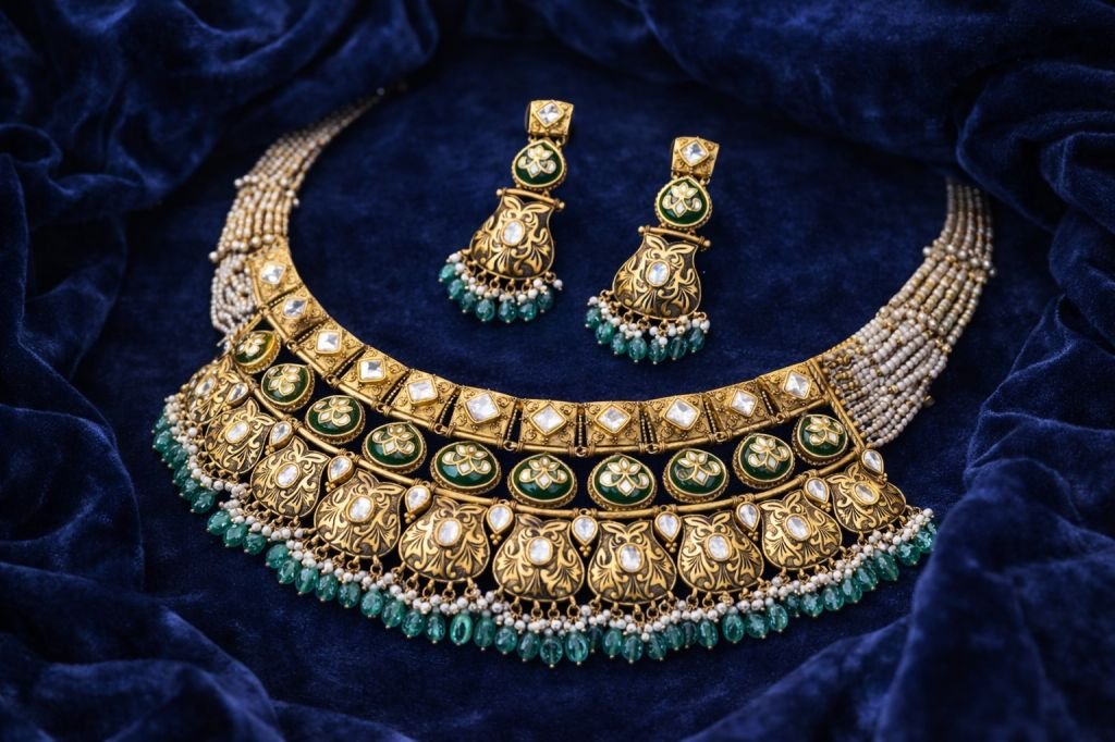 Royal Green Kundan Temple Choker Necklace Set – 92.5 Silver Gold Plated Bridal Jewellery