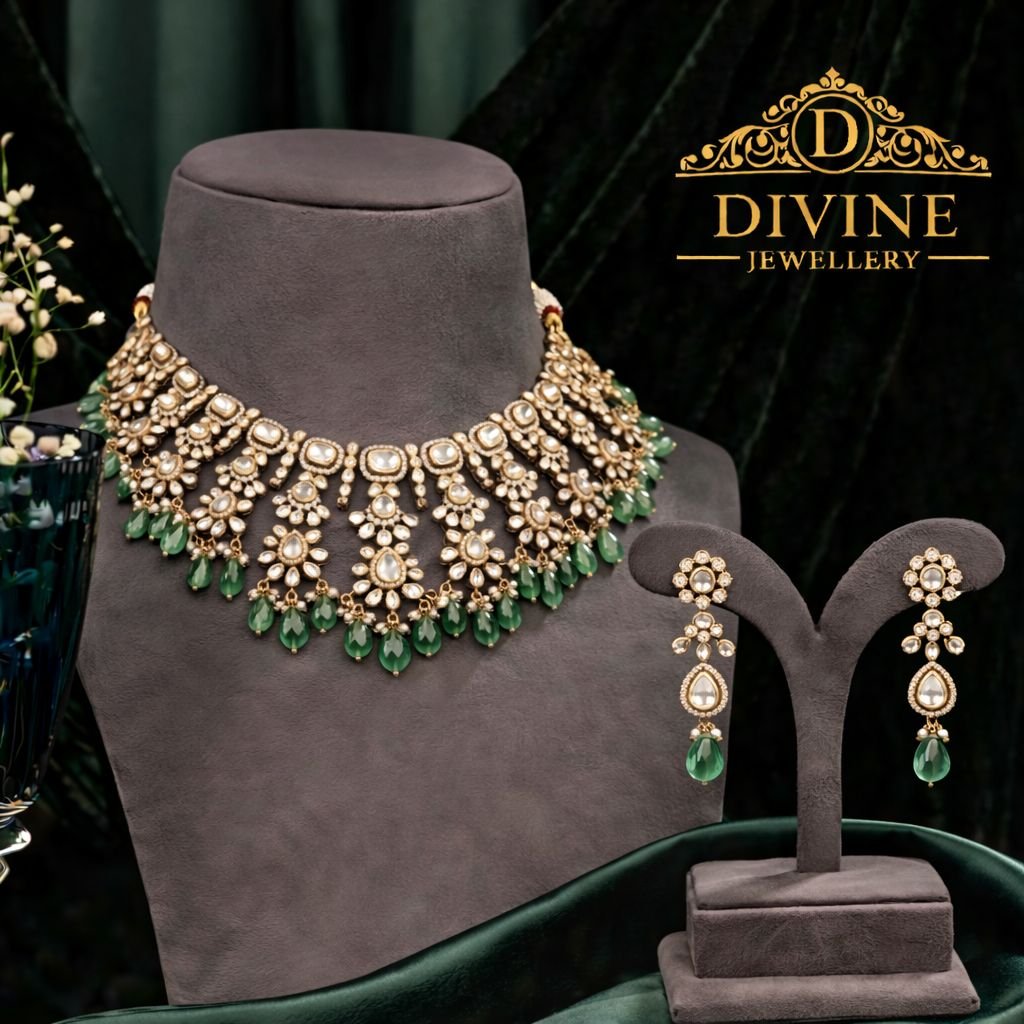 A luxurious choker necklace set featuring classic kundan-style stones with elegant emerald green drop beads, crafted in 92.5 silver with rich gold plating. Perfect for bridal and festive occasions.