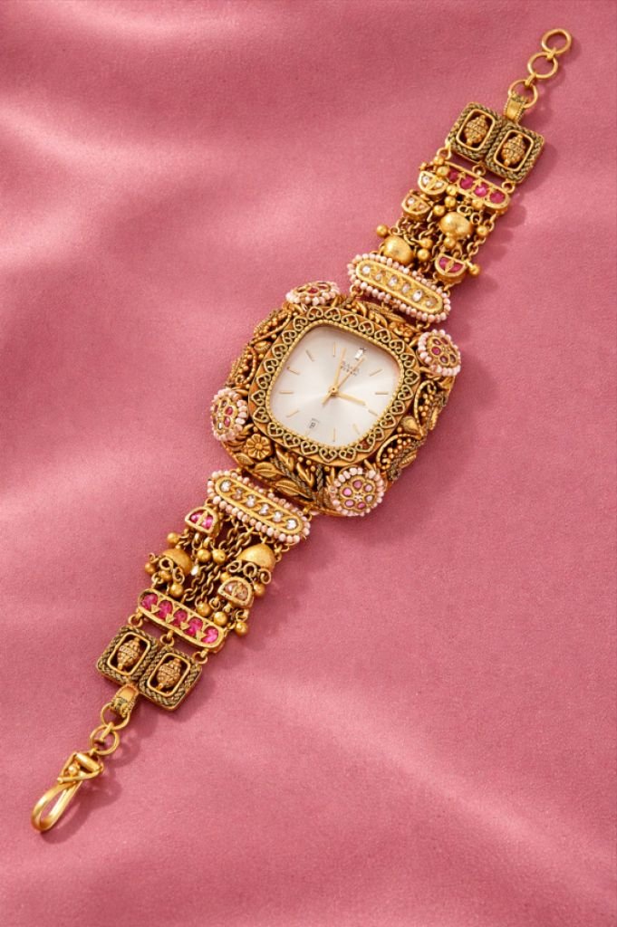 A luxurious jewellery-style bracelet watch crafted in 92.5 silver with gold plating, featuring kundan stones, meenakari detailing, and intricate antique design—perfect for festive and party wear.