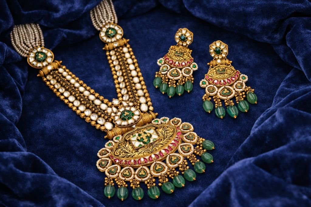 Royal Kundan Pearl Bridal Necklace Set with Green Drops – 92.5 Silver Gold Plated Temple Jewellery