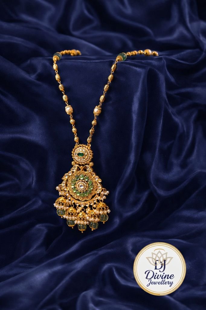 Elegant 92.5 silver gold-plated pendant necklace featuring kundan detailing, green stone accents, and pearl danglings. Perfect for festive and traditional wear.