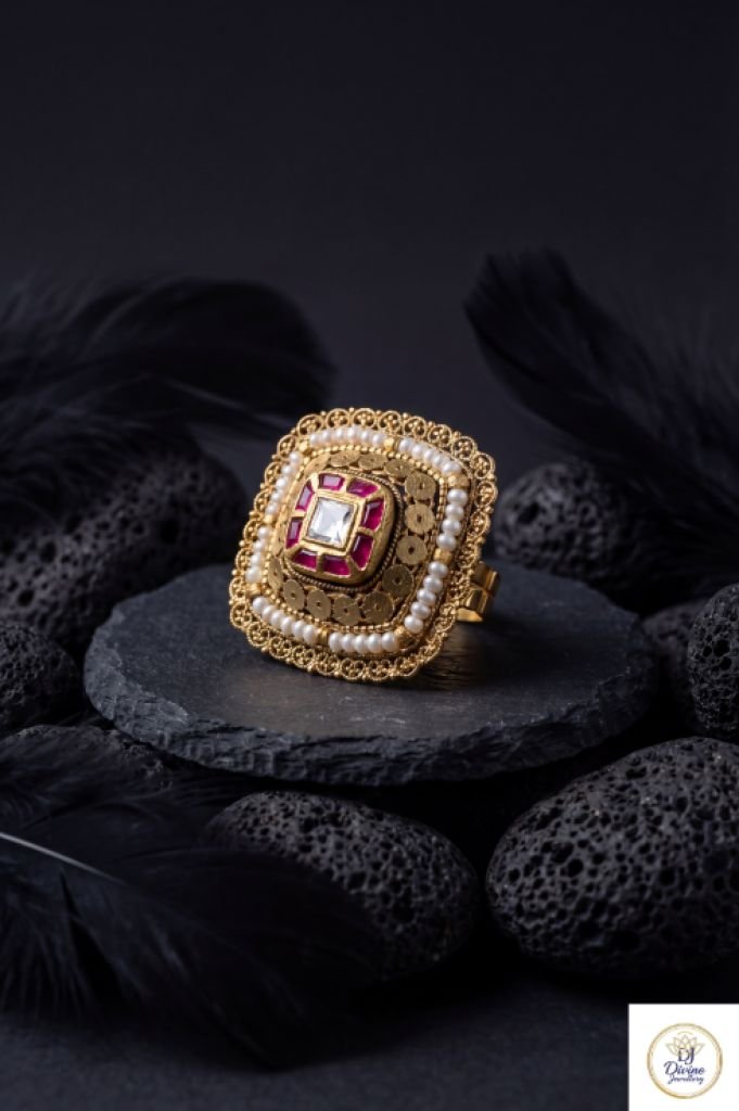 Royal Kundan Style Statement Ring with Pearl Detailing in 92.5 Silver Gold Plated | Divine Jewellery
