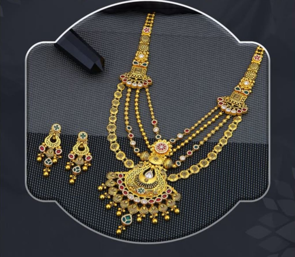 Grand 92.5 silver gold-plated layered long necklace set featuring temple motifs and kundan-style stones. Perfect for bridal and festive wear.