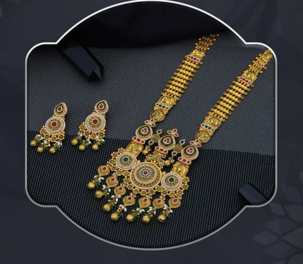 Grand 92.5 silver gold-plated temple long necklace set featuring layered design and kundan-style stones with matching earrings. Perfect for bridal and festive wear.