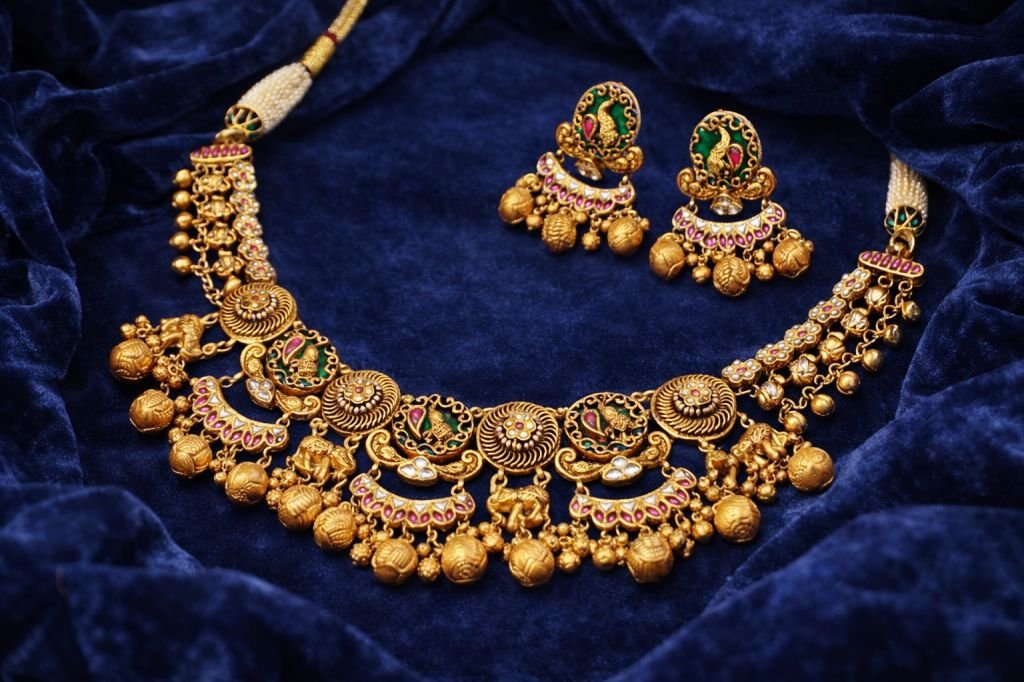 A grand peacock temple necklace set featuring intricate heritage motifs, vibrant enamel accents, and traditional gold danglers. Crafted in 92.5 sterling silver with premium gold plating, perfect for bridal and festive wear.