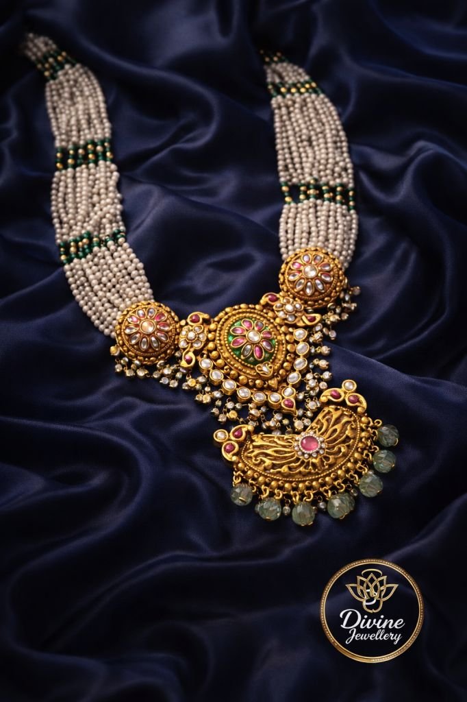 Royal Pearl Layered Temple Necklace Set with Kundan Pendant & Earrings – 92.5 Silver Gold Plated Bridal Jewellery