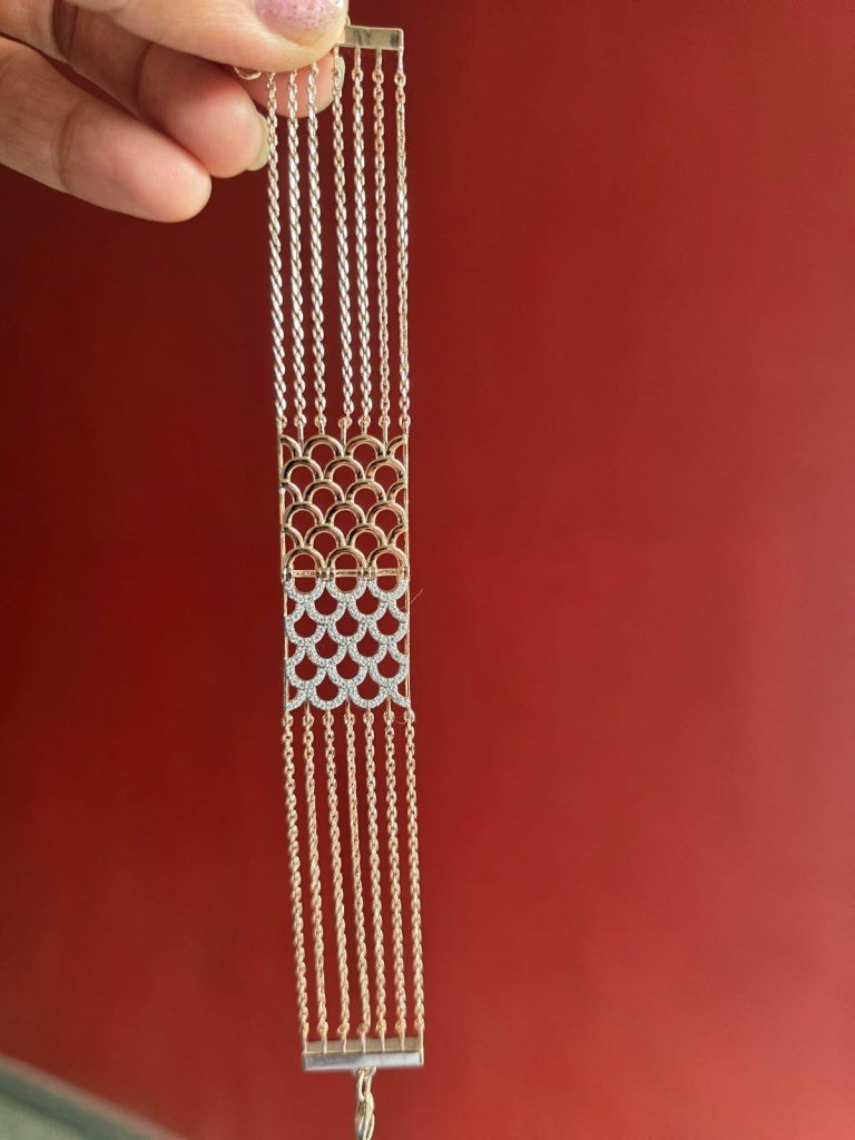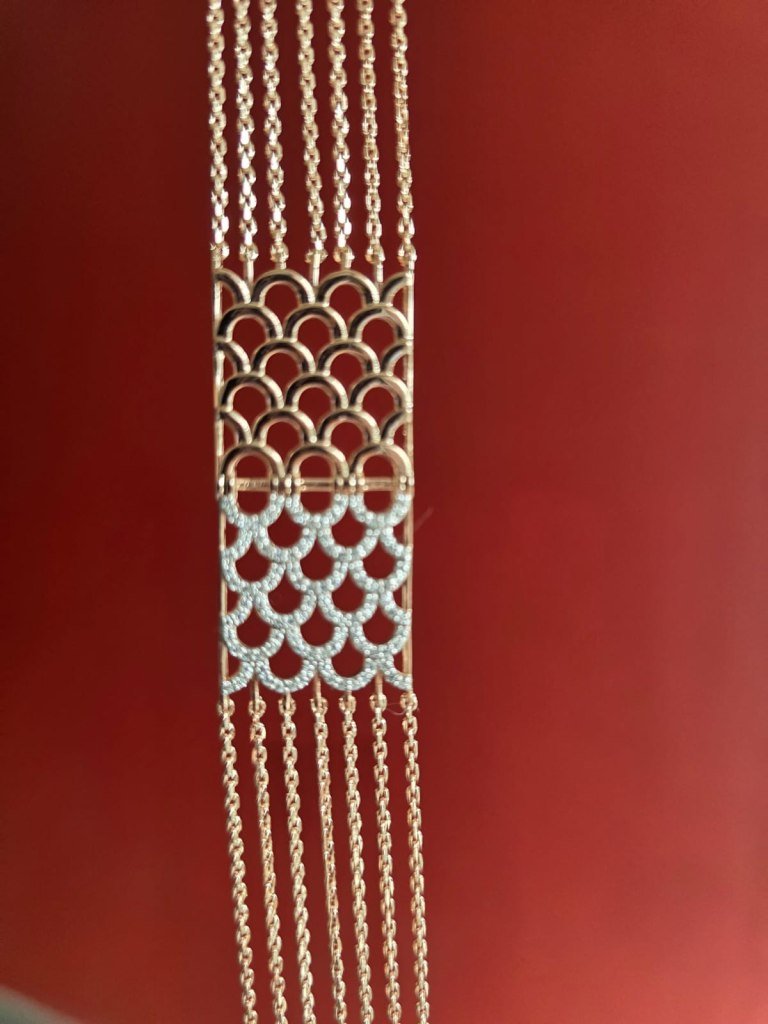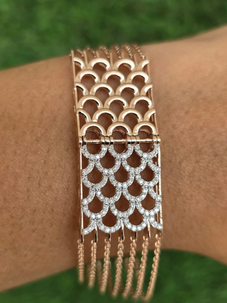 Product Type: Designer Statement Bracelet Style: Multi-Chain Wide Bracelet Design Theme: Scallop / Fish-scale Pattern Stone Type: High-shine crystal stones Finish: Premium Rose Gold Plated Occasion: Party, Wedding, Cocktail, Festive, Evening