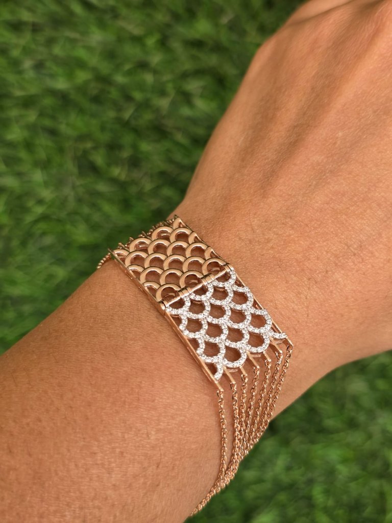 Royal Scallop Design Rose Gold Bracelet with Crystal Mesh Panel – Premium Multi-Chain Statement Bracelet for Women