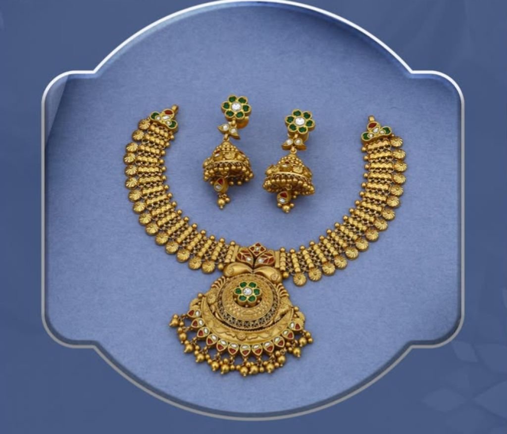 Elegant 92.5 silver gold-plated temple necklace set featuring layered coin design, green stone detailing, and traditional jhumka earrings—perfect for bridal and festive wear.
