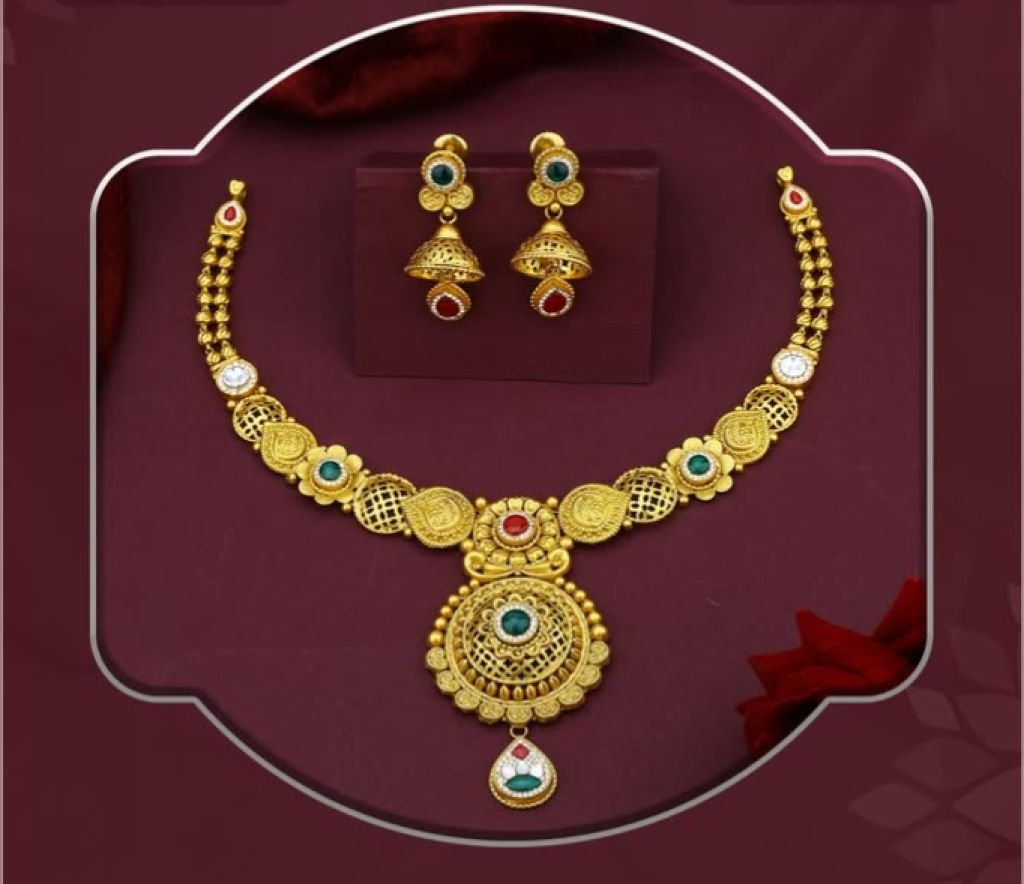 Elegant 92.5 silver gold-plated necklace set featuring temple coin and filigree design with kundan-style stones and traditional jhumka earrings. Perfect for bridal and festive wear.