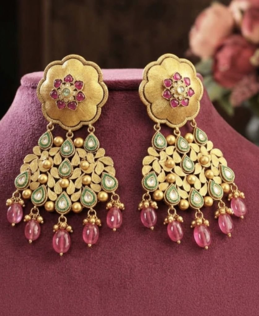 Royal Temple Floral Choker Necklace with Pink Drops & Green Stones – 92.5 Silver Gold Plated Bridal Jewellery | Divine Jewellery