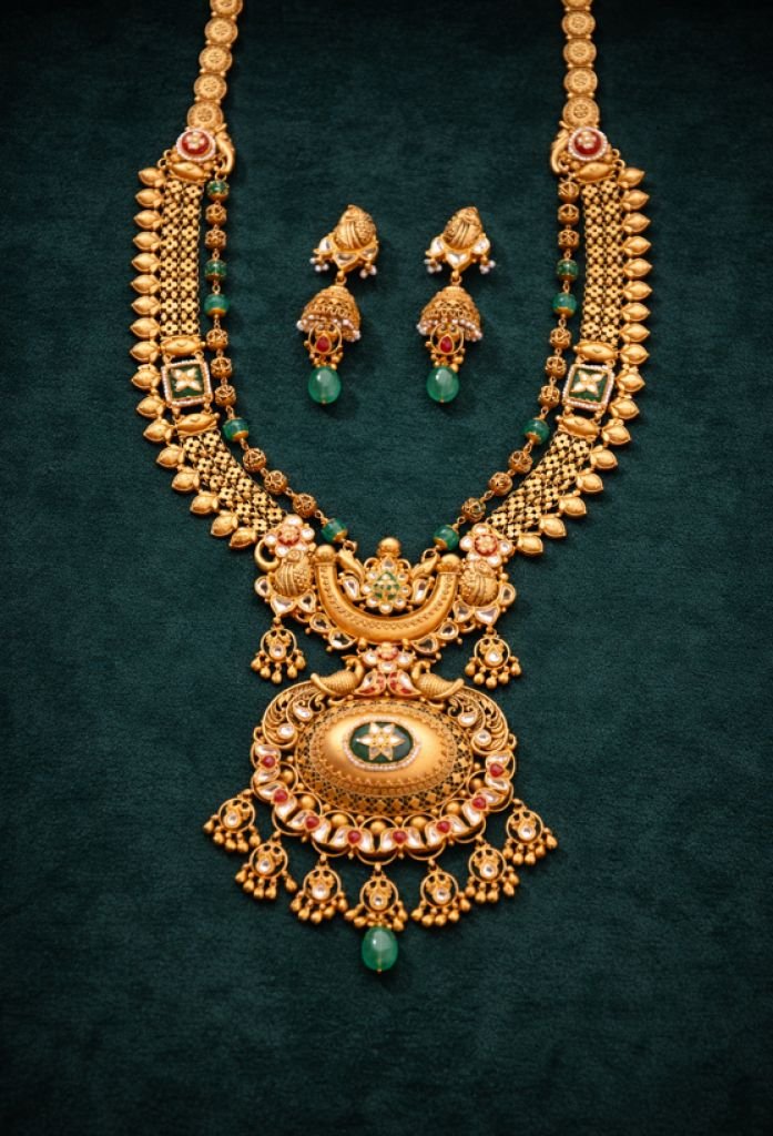 A grand temple-style long necklace set crafted in 92.5 silver with gold plating, featuring intricate detailing, green stone accents, and a bold statement pendant—perfect for bridal and festive wear.