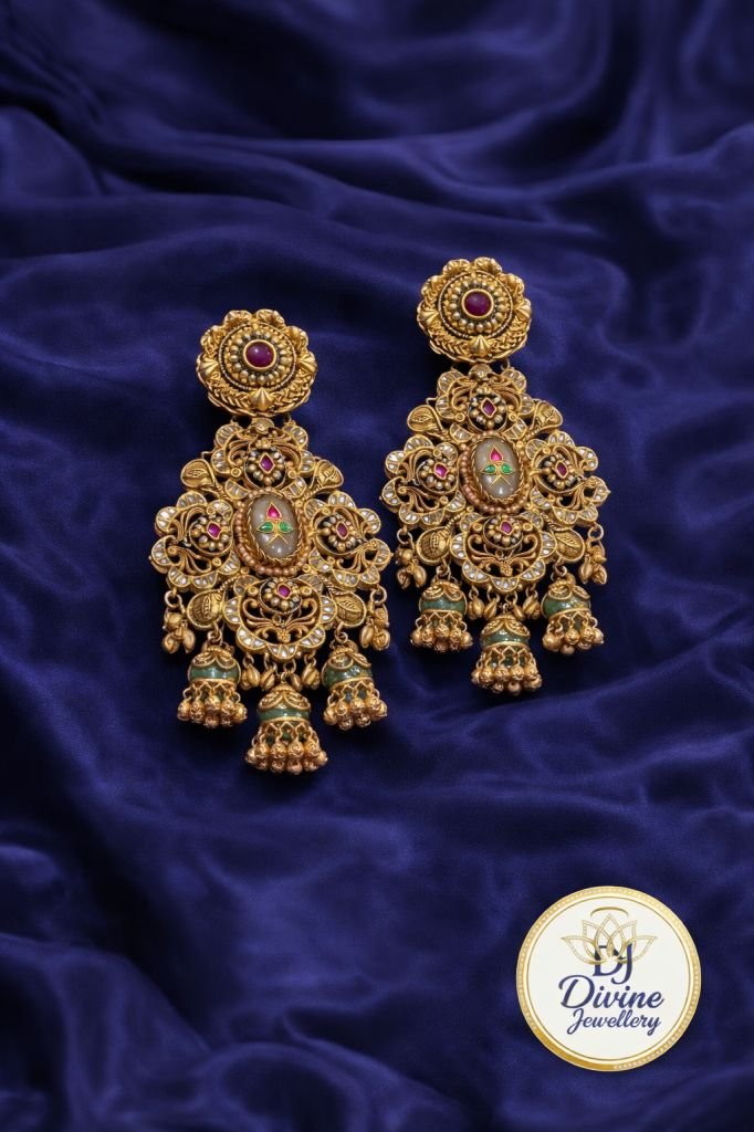 Royal Temple Long Pendant Necklace Set with Jhumka Earrings – 92.5 Silver Gold Plated Heritage Jewellery
