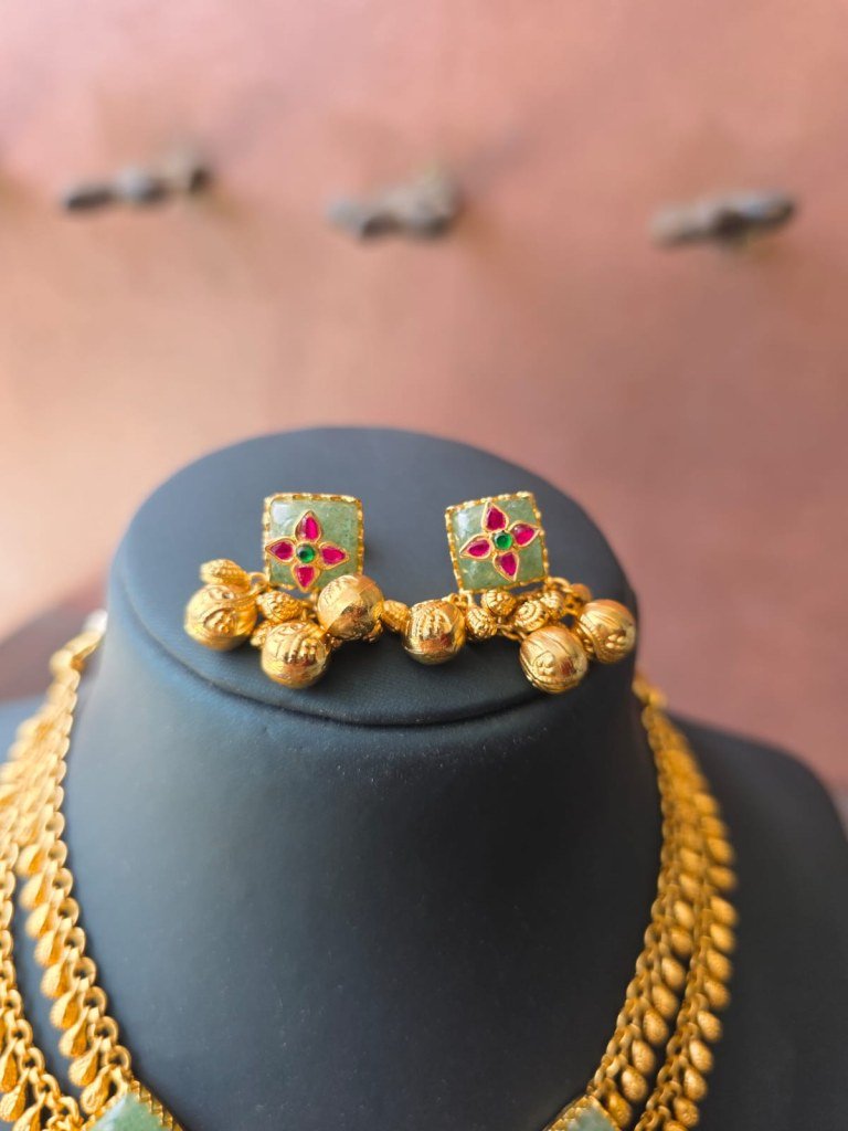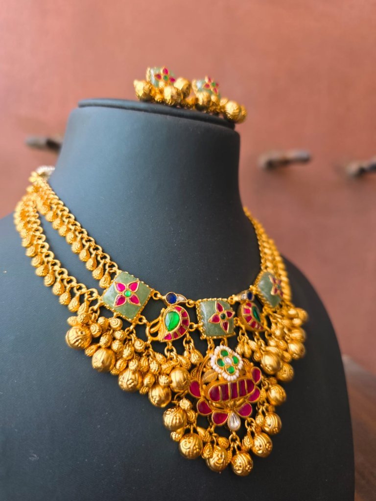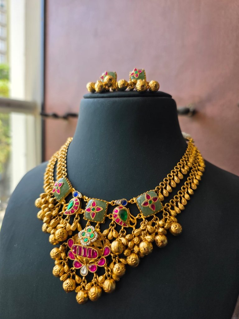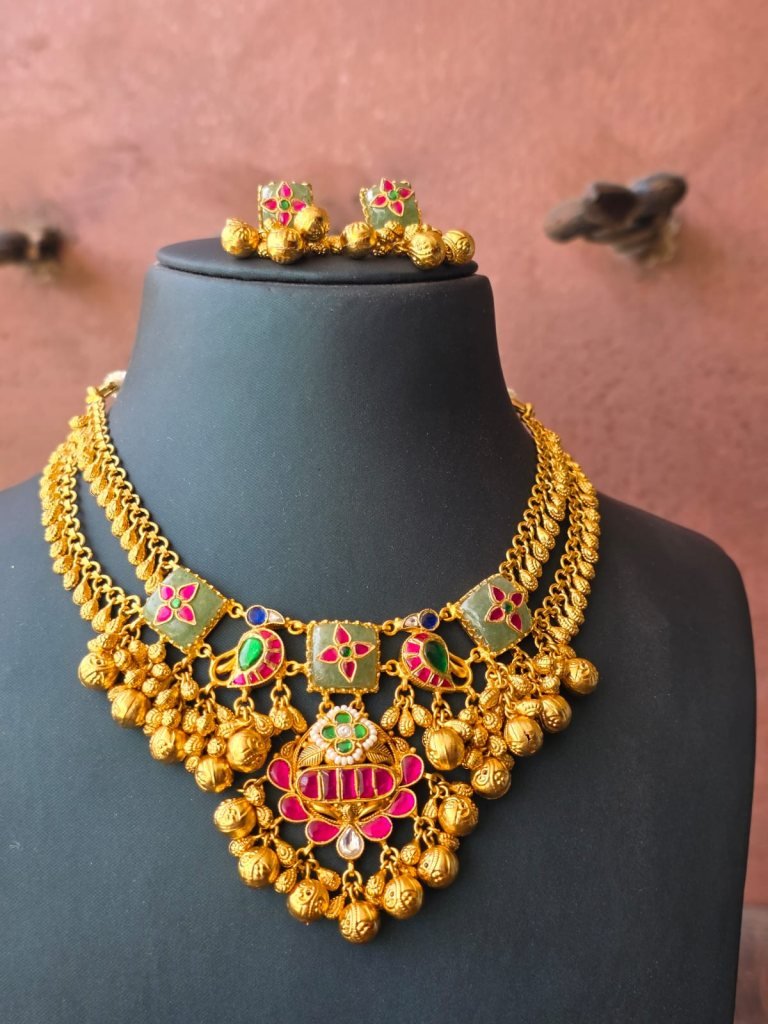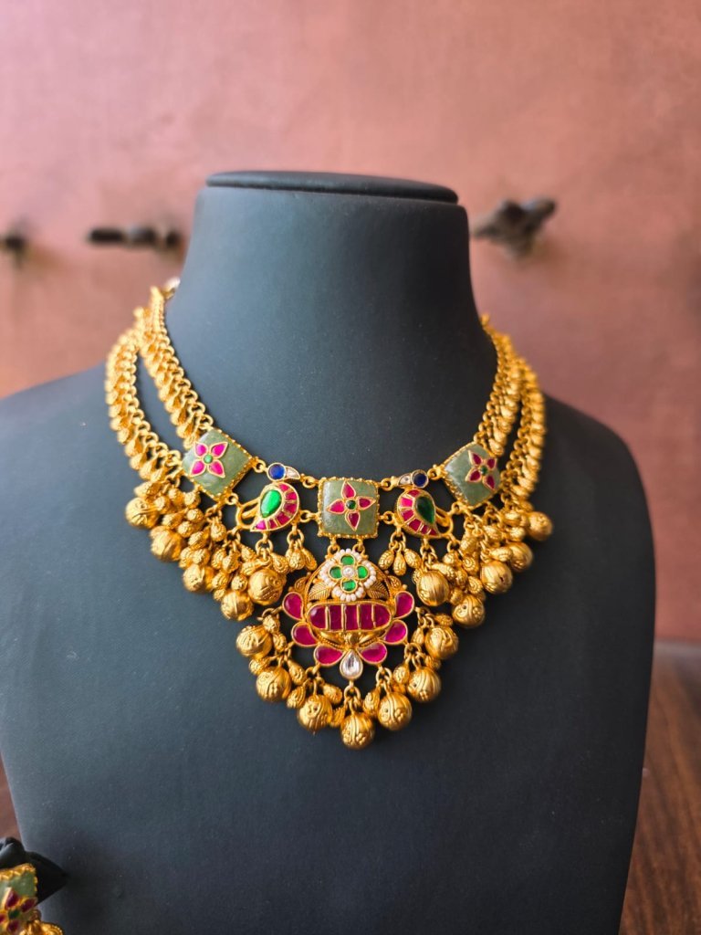 A rich temple-style necklace set with meenakari detailing and ghungroo drops, crafted in 92.5 silver with gold plating—perfect for bridal and festive wear.