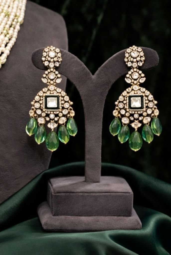 Elegant pearl layered necklace with Victorian polki pendant, black enamel detailing, and green drop accents.